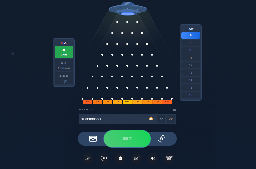 Plinko features a triangular peg board down which a ball is dropped from the top. As the ball descends, it bounces against pegs, eventually landing in one of several slots at the bottom, each associated with a different multiplier value.